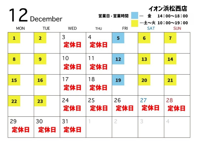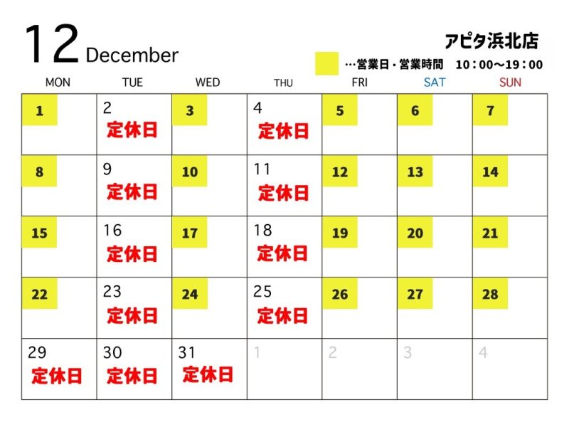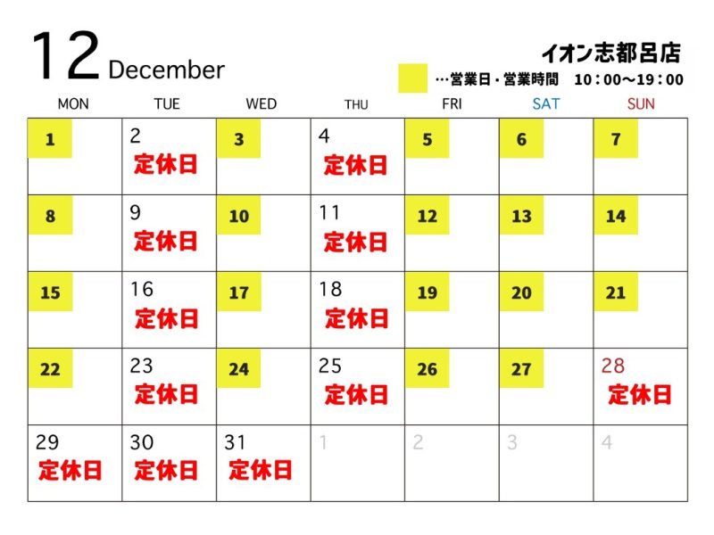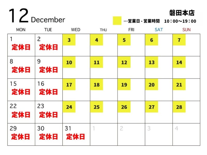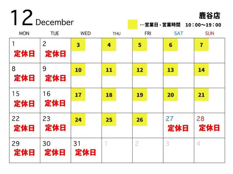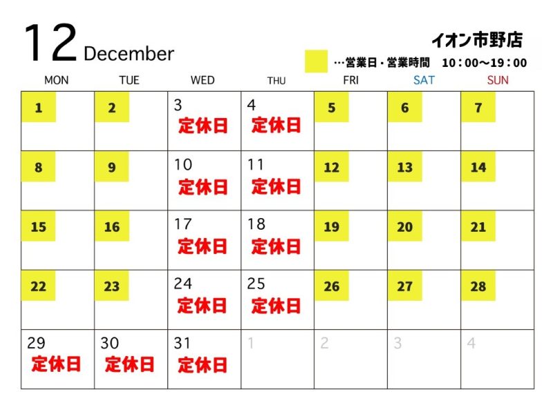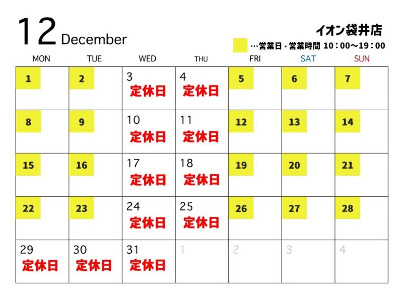 12月より、全店舗の営業時間が10:00~19:00に変更となります。